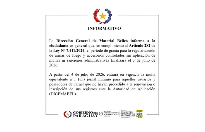 La Dirección General de Material Bélico informa a la ciudadanía en general que, en cumplimiento al Artículo 282 de la Ley N° 7.411/2024, el período de gracia para la regularización de armas de fuego y accesorios controlados sin aplicación de multas ni sanciones administrativas finalizará el 3 de julio de 2026.