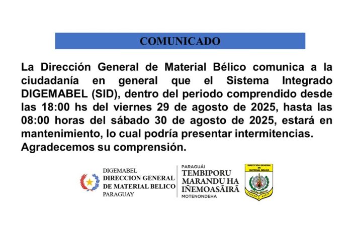 La Dirección General de Material Bélico comunica a la ciudadanía en general que el Sistema Integrado DIGEMABEL (SID) podría presentar intermitencias durante su uso dentro del periodo comprendido entre el viernes 29 de agosto de 2025, a las 18:00 horas, hasta el sábado 30 de agosto de 2025, a las 08:00 horas, debido a motivos de mantenimiento.