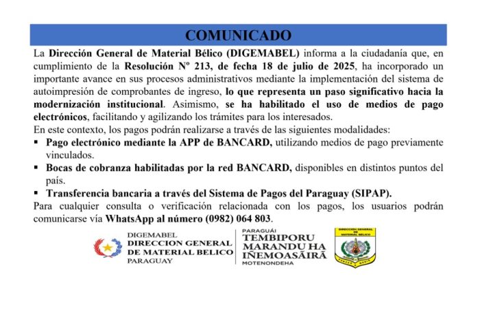 POR LA CUAL SE AUTORIZA LA IMPLEMENTACION DE LA EMISION DE COMPROBANTES DE INGRESO EN CALIDAD DE AUTOIMPRESORES, SE ESTABLECEN SERIES Y ESTRUCTURA PARA DICHOS COMPROBANTES, Y SE HABILITAN MEDIOS DE PAGO ELECTRONICO PARA LA DIRECCION GENERAL DE MATERIAL BELICO (DIGEMABEL).